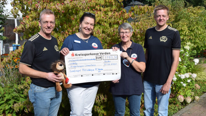 Im Rahmen des Tags der offenen Tür beim Kinderhospiz Löwenherz in Syke konnte der TSV Lohberg nun den Spendenscheck übergeben. Mit fast 3.800 EUR ist eine tolle Spendensumme zusammengekommen und die Verantwortlichen freuten sich sehr darüber, dass die beiden Sportvereine mit dem Benefizspiel an die Einrichtung in Syke gedacht haben. Das Angebot des Kinder- und Jugendhospiz richtet sich an die komplette Familie, einschließlich der gesunden Geschwister. Sie können in der naturnahen Anlage gemeinsam zu Gast sein, um wieder durchzuatmen und Kraft zu tanken, während das kranke Kind von professionellen Pflegekräften rund um die Uhr versorgt wird. Bis zu 200 Familien können im Jahr zu Löwenherz kommen, erfuhr der TSV-Vorstand um Lars Rosebrock-Heemsoth und Steffen Lühning vor Ort. Für die Finanzierung des umfangreichen Angebotes ist der Verein Kinderhospiz Löwenherz e.V. auf Spenden angewiesen und auch viele Ehrenamtliche unterstützen in der Küche, im Garten, in der Pflege oder in der Öffentlichkeitsarbeit.