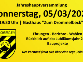 Der TSV Lohberg e.V. lädt alle Mitglieder zur Jahreshauptversammlung 2026 ein. Die Versammlung findet am Donnerstag, 5. März 2026, um 19:30 Uhr im Gasthaus „Zum Drommelbeck“ in Hohenaverbergen statt. Auf der Tagesordnung stehen unter anderem […]